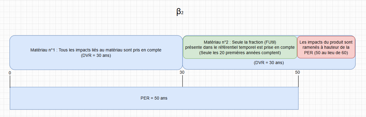 Dans le cas où la DVR est inférieure à la PER, le calcul doit intégrer un β₂ représentant les renouvellements du matériau. Dans l’exemple ci-dessus (DVR = 30 ans, PER = 50 ans), on distingue :