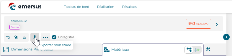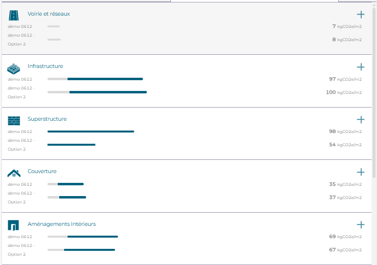 Vous retrouverez ici les valeurs totales de kgCO2e/m2 de chaque variante, avec un découpage par type de lot (gros œuvre/CEA/lots techniques/chantier) et les valeurs relatives. Vous pouvez également exporter ce graphique avec le bouton "Exporter" en haut à gauche !