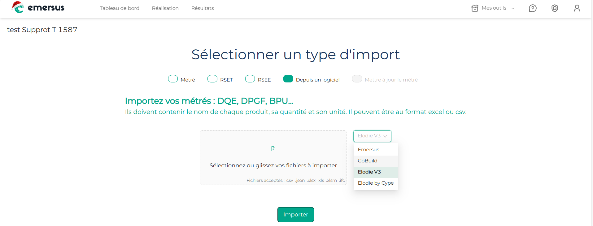 Le champ d'import vous demande alors depuis quel logiciel vous souhaitez faire l'extraction de votre ACV. Choisissez "Elodie" dans le menu déroulant.