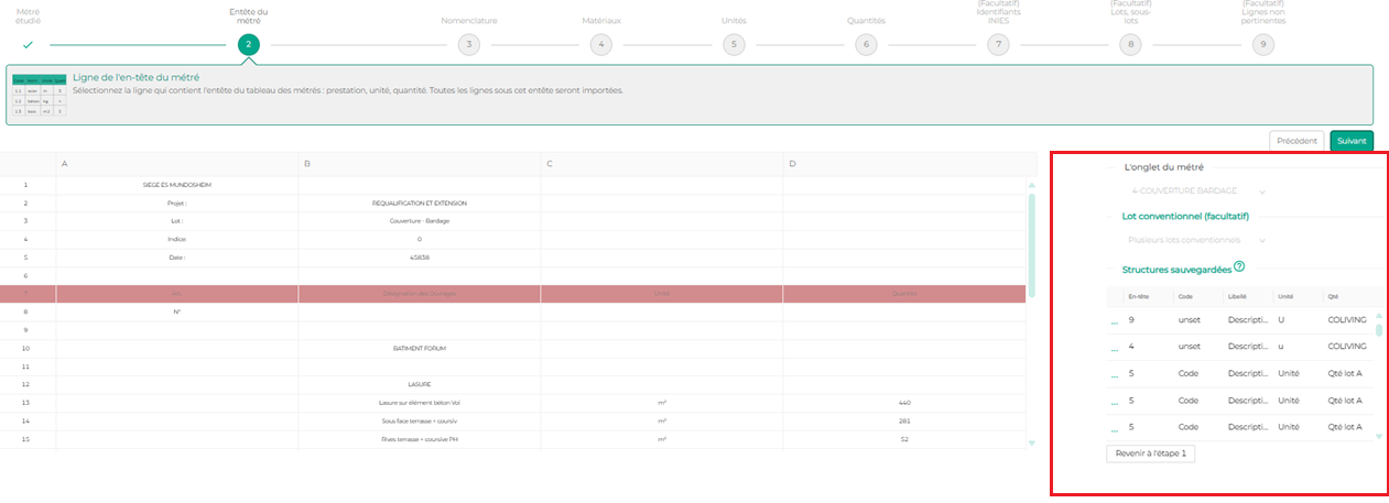 - l'attribution des quantités aux zones et bâtiment (étape 6) se fait également sur le modèle du premier onglet importé.