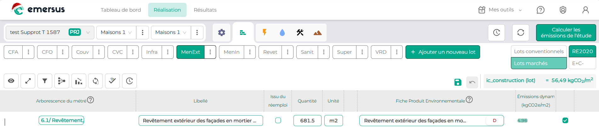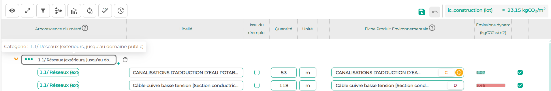 Lors de l'import, l'algorithme de machine learning a affecté à chaque composant un lot conventionnel et un sous-lot parmi ceux définis dans la RE2020 : vous pouvez le lire dans l’arborescence du métré.