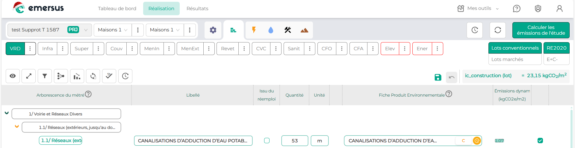 La vue par lot conventionnel permet de voir les matériaux triés selon les lots et sous-lots de la RE2020.