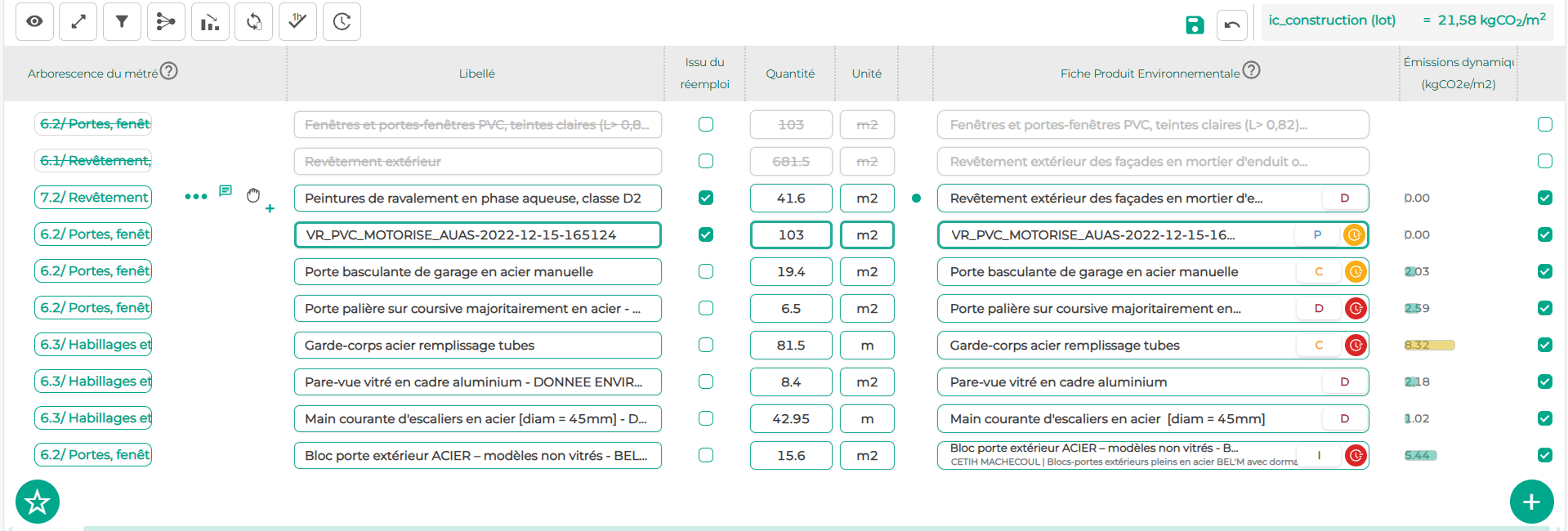 Si l’un de vos composants est issu du réemploi, vous pouvez l’indiquer facilement : cliquez sur le bouton de la colonne "Issu du réemploi" .