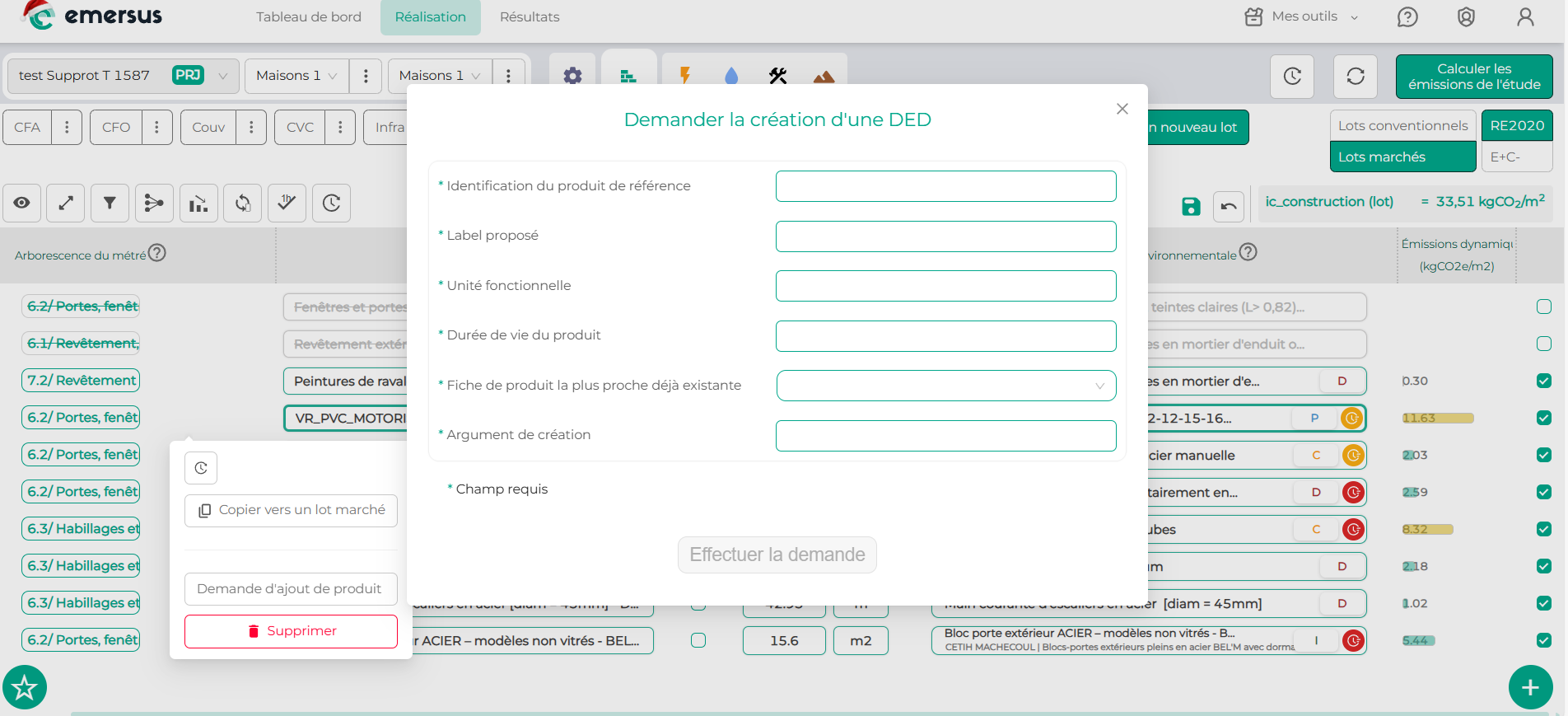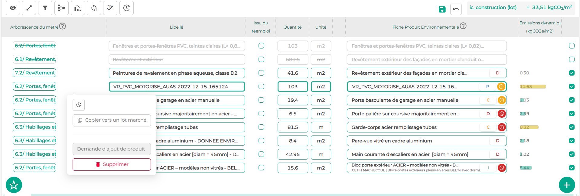 Les délais de création de cette fiche peuvent être de quelques mois.Si vous souhaitez la création d’une nouvelle Donnée Environnementale par Défaut, cliquez sur les trois petits points qui apparaissent sur la ligne quand vous la survolez avec la souris. Cliquez sur « Demande d’ajout de produit ».