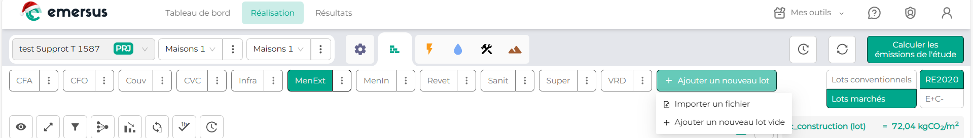 Pour insérer un nouveau lot, il suffit d’être dans l’onglet Réalisation et de cliquer sur le bouton « Ajouter un nouveau lot » en haut de la page, à droite des lots existants.