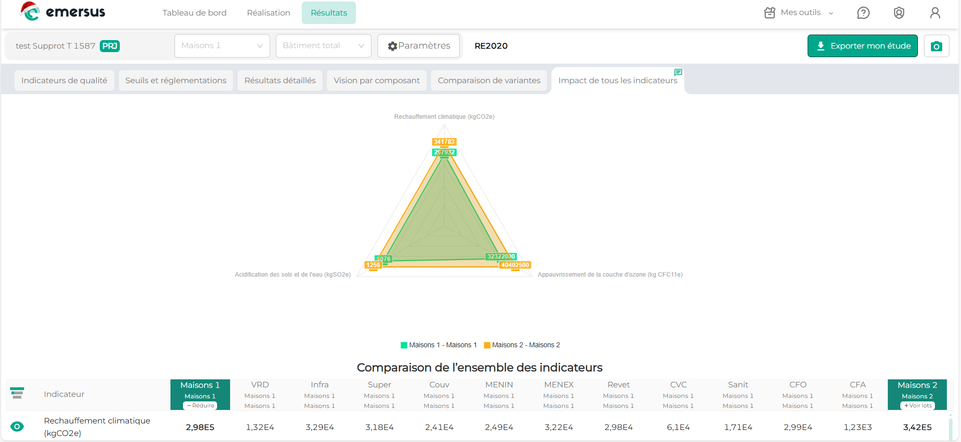 Ces indicateurs s'ajoutent au graphique "radar" en haut de l'écran, avec une couleur par bâtiment et zone. Les valeurs de chaque indicateur peuvent être trouvées sur le graphique ainsi que dans le tableau à droite.