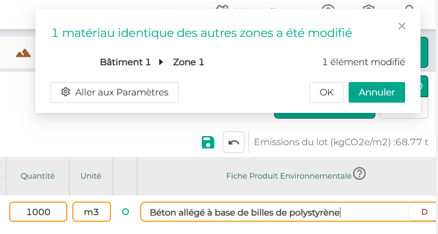 Une fois les conditions réunies, lorsque vous modifiez certaines données, elles seront automatiquement modifiées sur les autres zones et bâtiments possédant un matériau respectant les conditions.