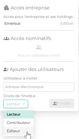 Renseignez l'adresse mail de la personne à qui vous souhaitez partager l'étude et choisissez le rôle que vous souhaitez lui attribuer.