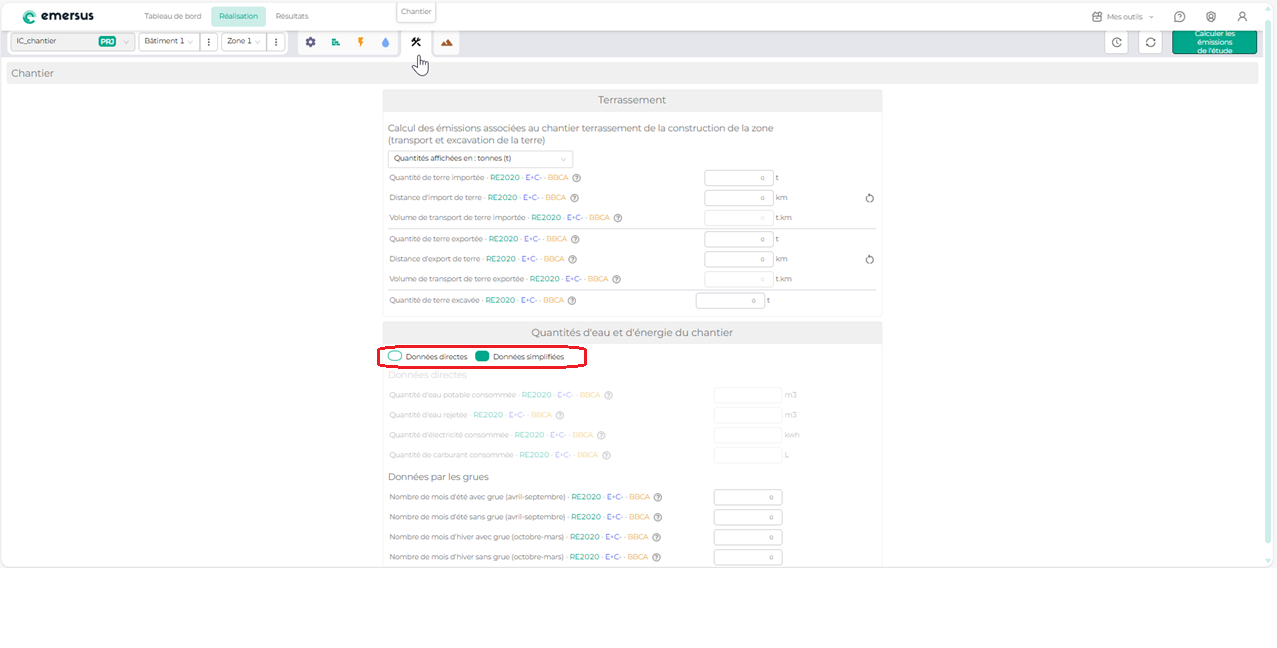 Pour renseigner les impacts liés au contributeur chantier sur Emersus, plusieurs informations seront à compléter selon la méthode choisie (simplifiée ou détaillée) et les éléments que vous souhaitez renseigner.