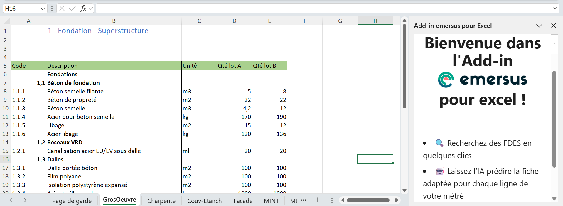 Cet add-in vous permet, à partir d'informations restreintes (libellé et unité d'un produit), d'identifier rapidement les FDES qui correspondent à vos produits ainsi que les émissions liées aux FDES identifiées.