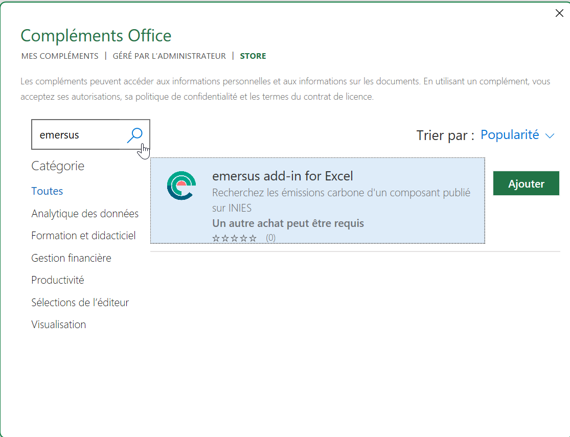 Renseigner "emersus" dans la barre de recherche et ajouter l'add-in.