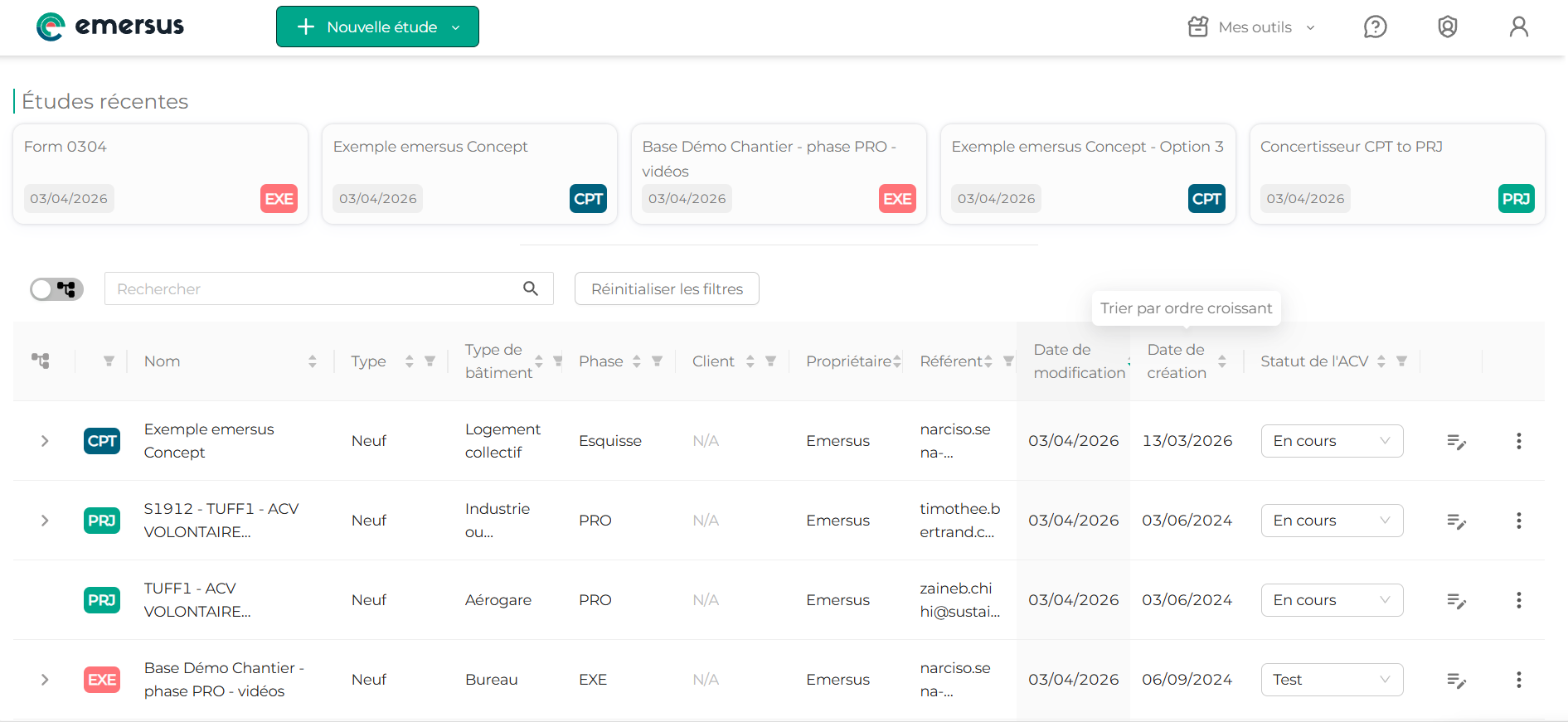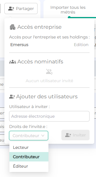 Un nouveau rôle “Contributeur“ est désormais disponible lors du partage d’une étude Emersus. Ce rôle permet à un utilisateur de : consulter l’étude, modifier les données et créer des variantes, tout en restreignant le partage de l’étude, qui reste réservé au Créateur / Éditeur.