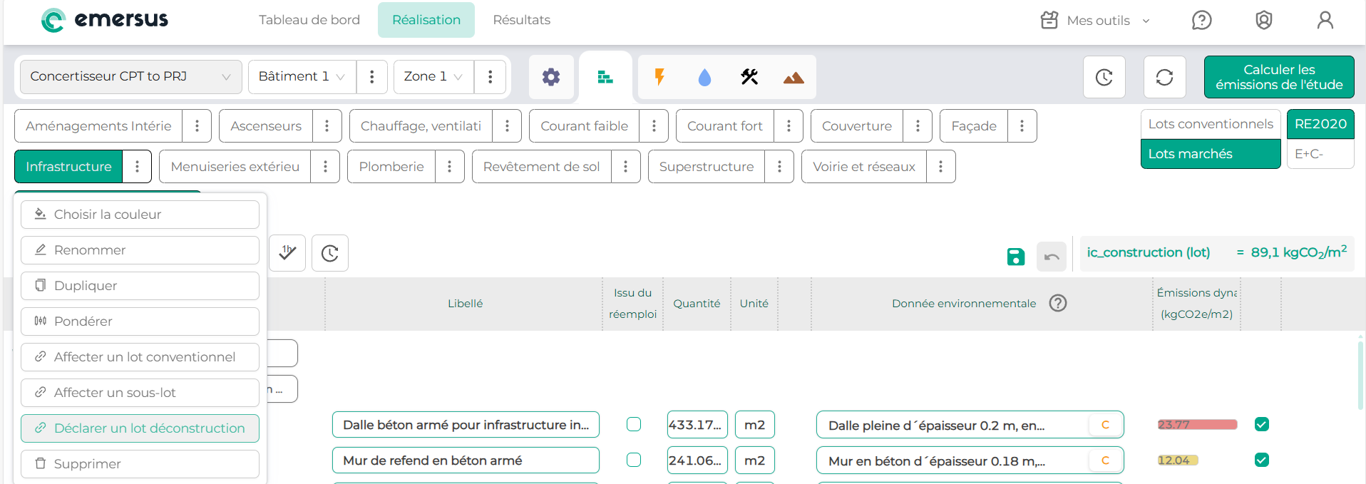 Sur cette même vue, emersus Projet indiquera directement quel cas concerne votre zone et si l'Ic Deconstruction doit être pris en compte.