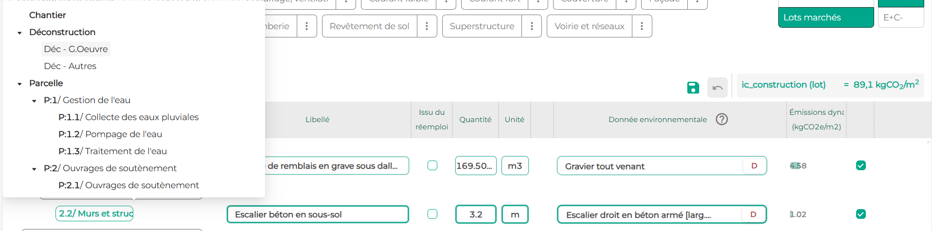 Il est également possible d'attribuer vos produits ligne par ligne à un lot déconstruction, similairement à l'alotissmeent RE2020/E+C- :