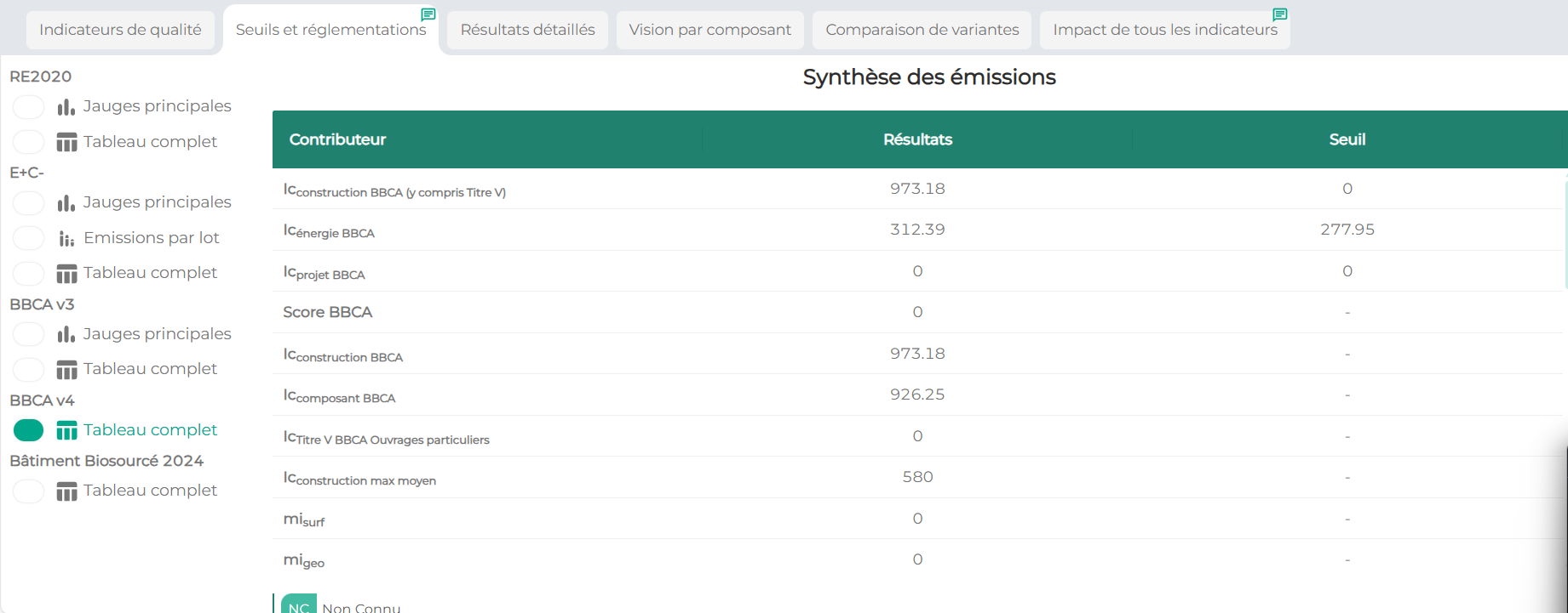 L’onglet « Seuils et certifications » gagne une nouvelle catégorie ! Vous pouvez maintenant y trouver le tableau de résultats BBCA V4 pour votre étude ACV, au niveau de chaque zone.
