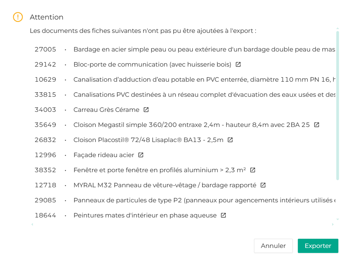 Si vous tentez d'exporter votre dossier de fiches environnementales depuis les Résultats et qu'une/des fiches manquent à l'appel, vous recevez un avertissement pour vous prévenir des manques relevés par l'outil.