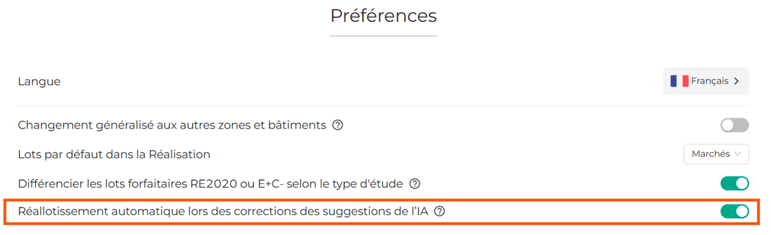 Vous avez la main sur vos préférences concernant le réallotissement automatique : définissez depuis vos Préférences si vous souhaitez que les lots conventionnels RE2020 soient automatiquement changés lors de la modification de FDES, ou si vous souhaitez faire cette opération manuellement