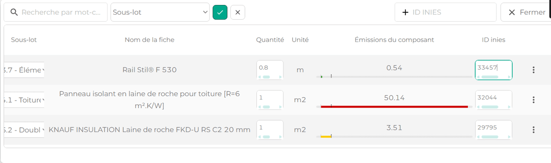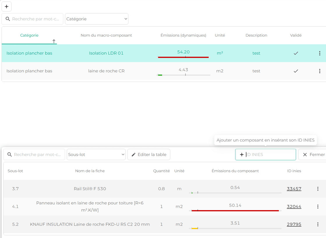 Dans la création d’un macro-composant, vous pouvez ajouter un composant en saisissant directement l’identifiant INIES de sa fiche, recherche accélérée, zéro friction.