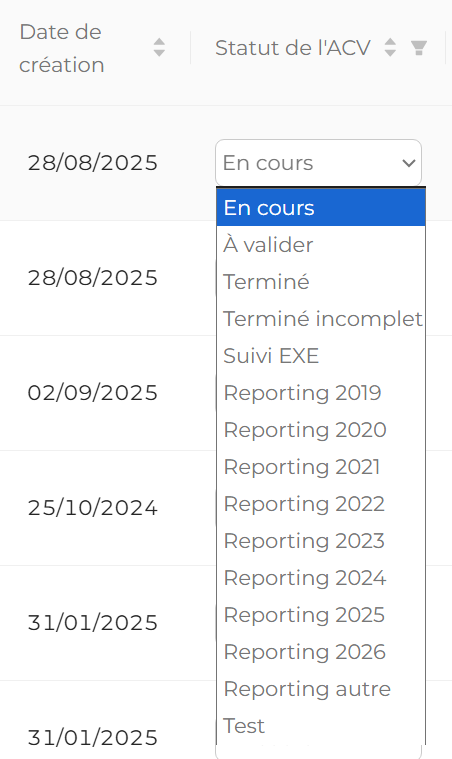 Nouveau statut pour mieux qualifier vos études ACV lorsque celles-ci relèvent du reporting 2026. Cette étiquette facilite le suivi réglementaire et la communication interne, sans modifier les règles de calcul.